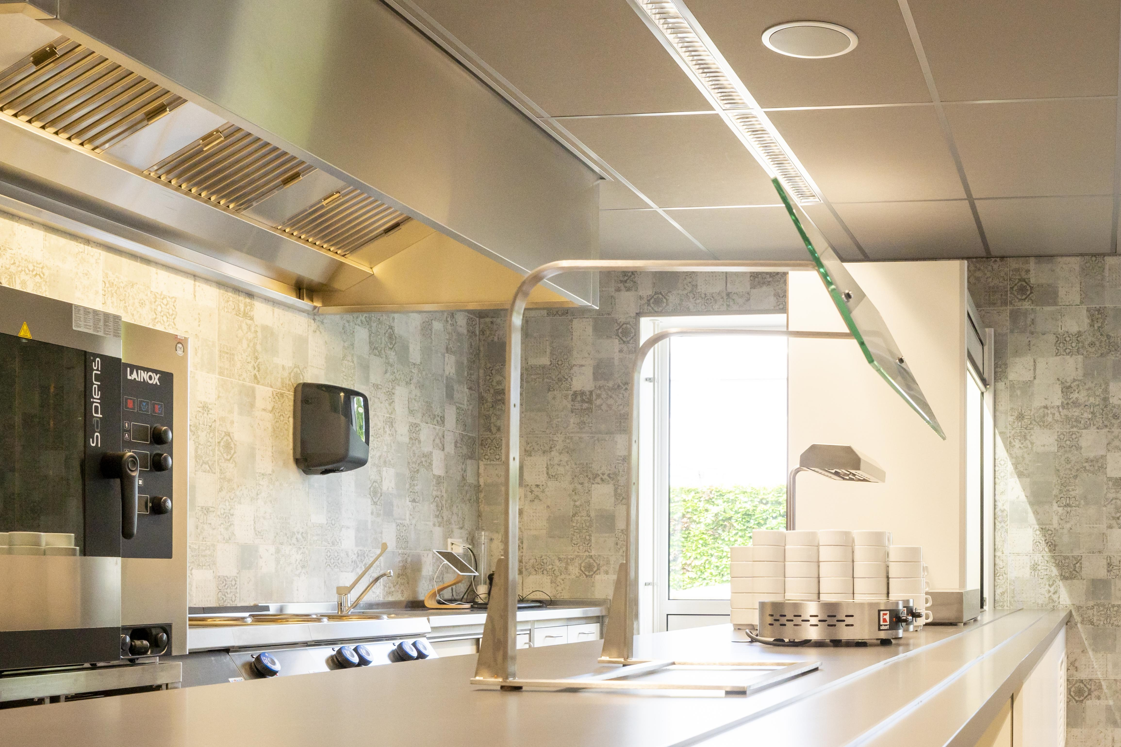 Vanaf het eerste ontwerp hebben wij meegedacht over de routing, de inrichting van de keuken, spoelkeuken, opslag, uitgifte en het restaurant totaal alsmede de functie hiervan. Transparantie was continue het sleutelwoord in de ontwerpsessies, belangrijk bij de vraag om ook in de daluren de restaurantomgeving een prettige plek te hebben waar je kunt ontmoeten, bespreken, inspireren en relaxen.