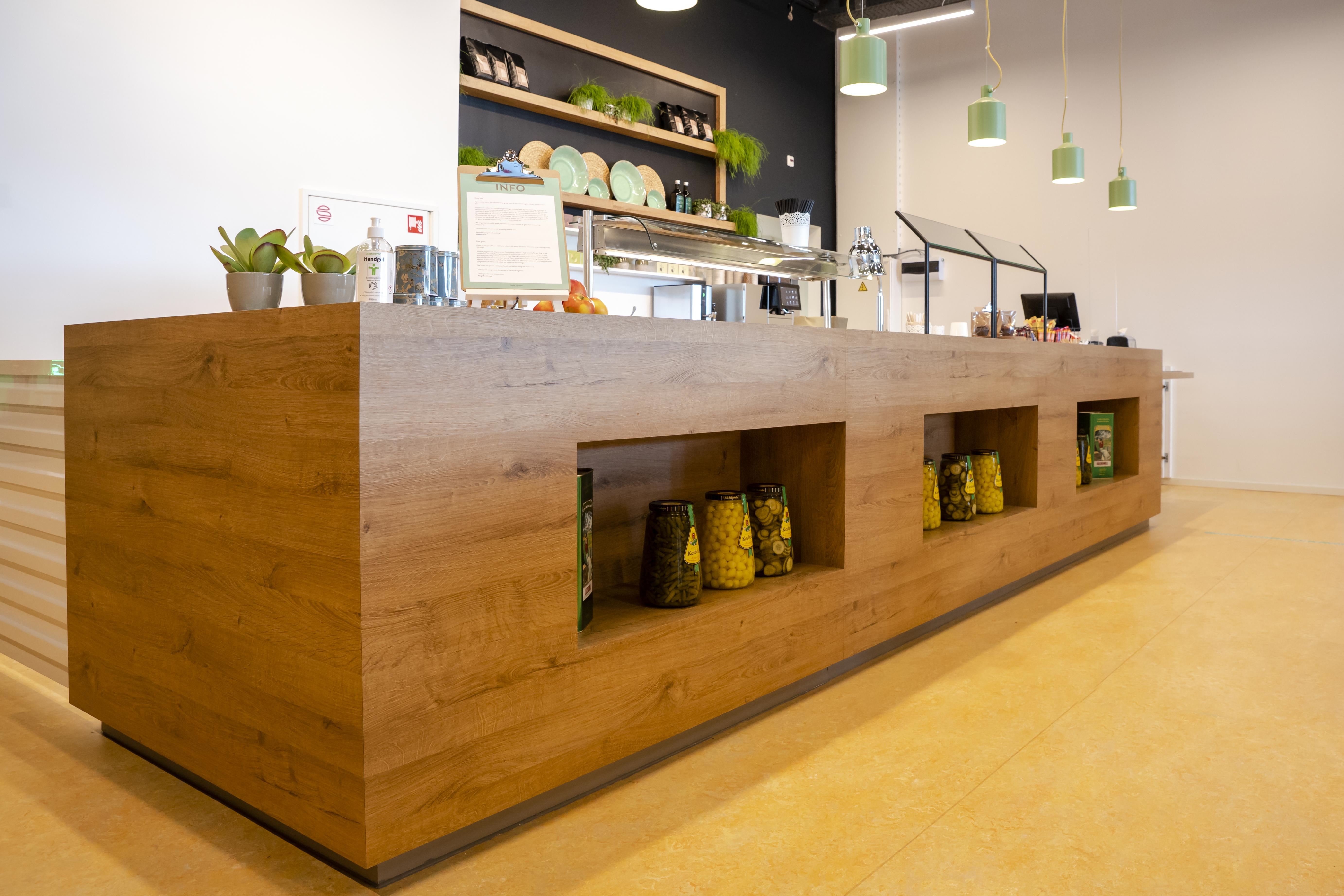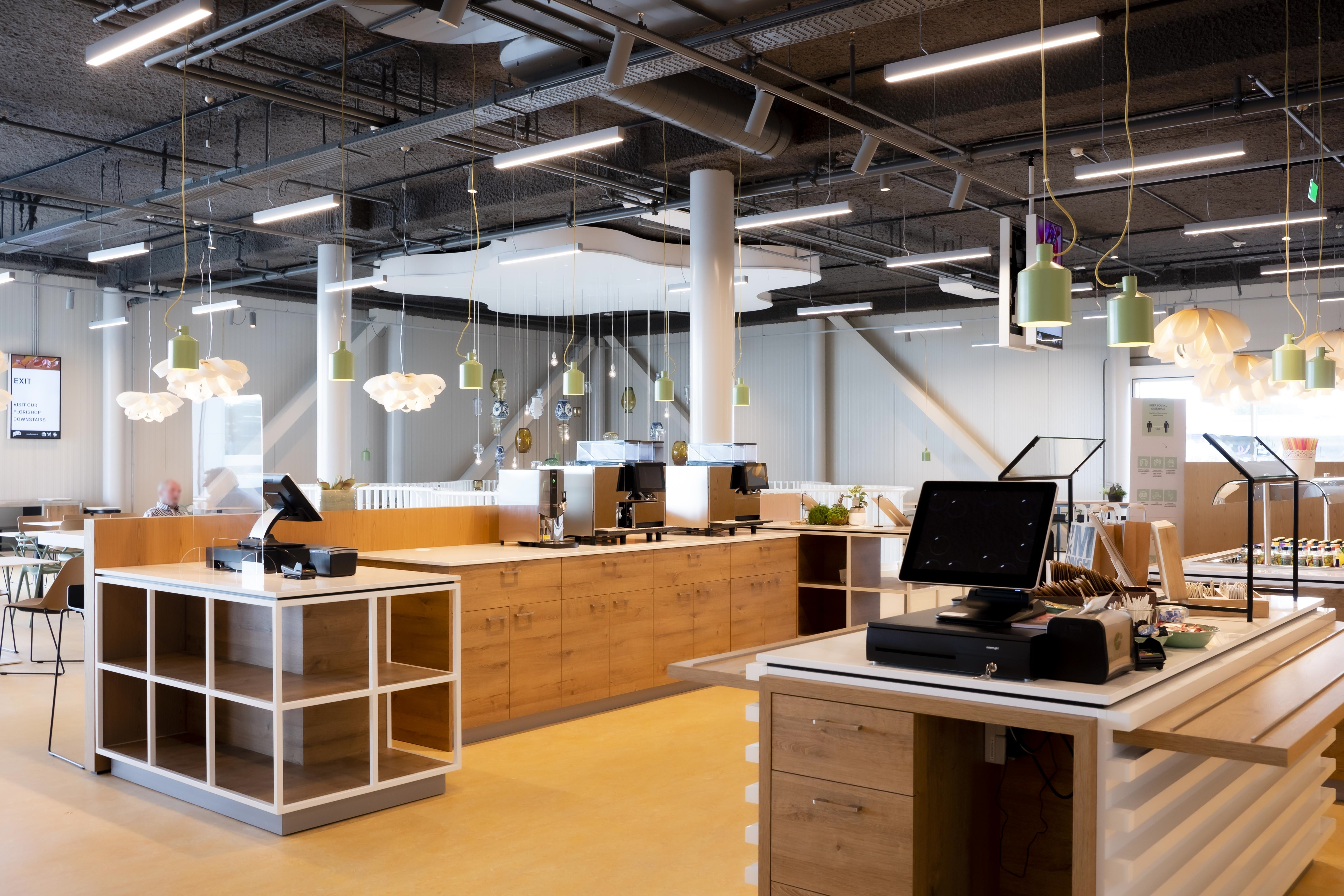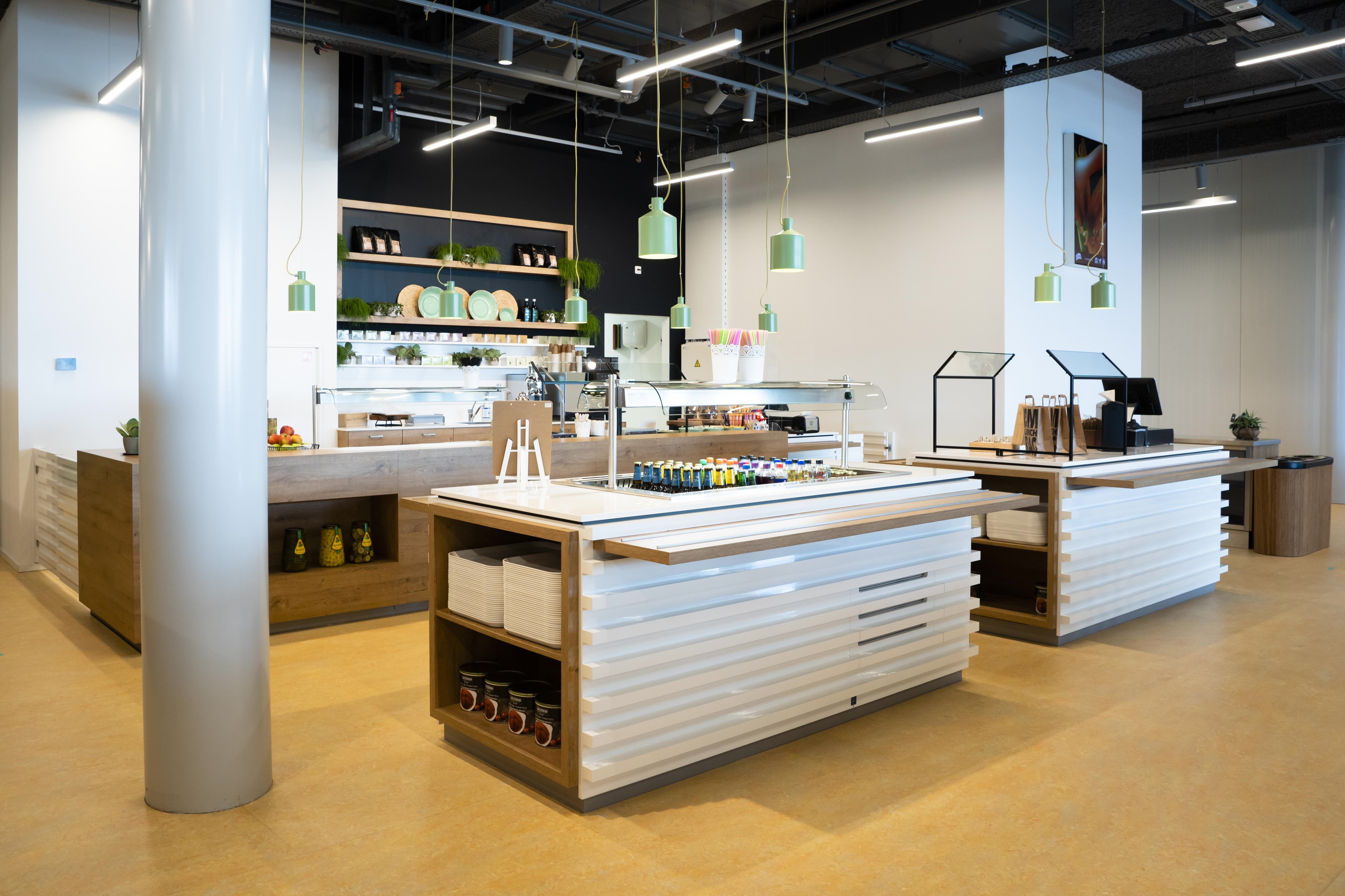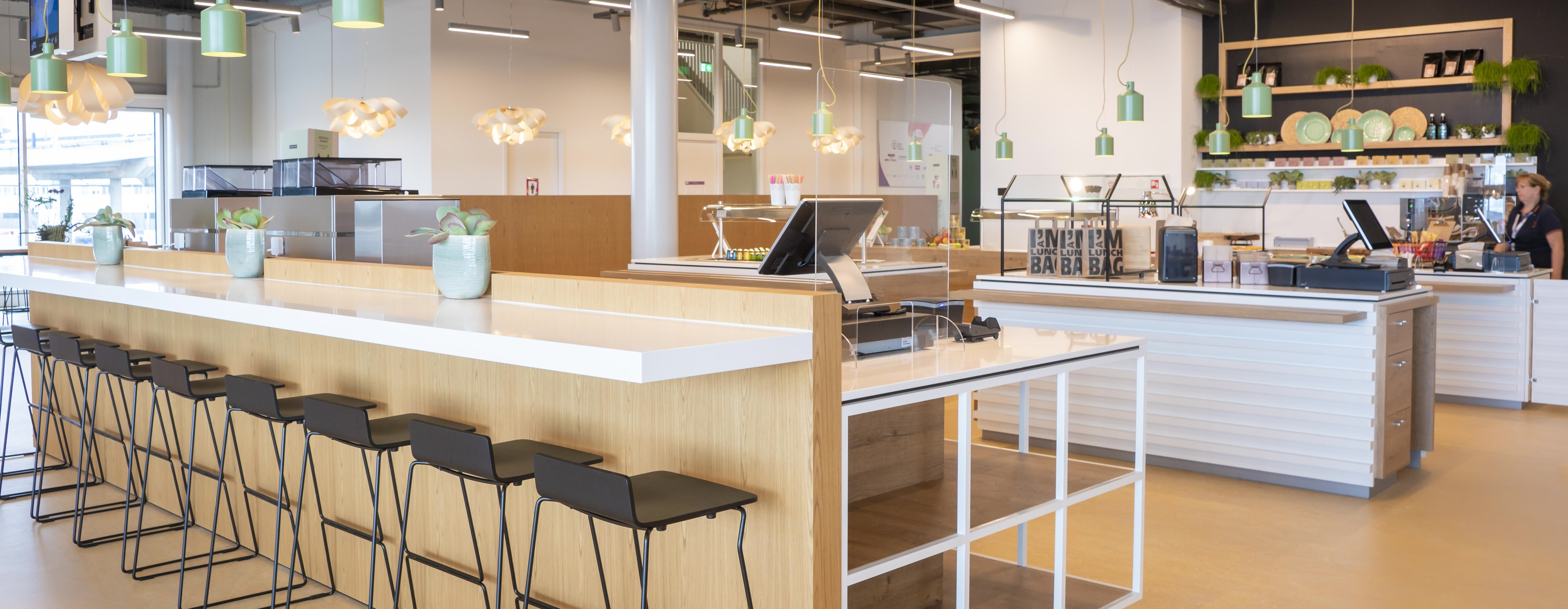 Het uitgiftegebied is voorzien van brede looproutes en meerdere kassa's om af te rekenen. De warme keuken is een rechte opstelling en de spoelkeuken is in een optimale hoek opstelling geplaatst.
