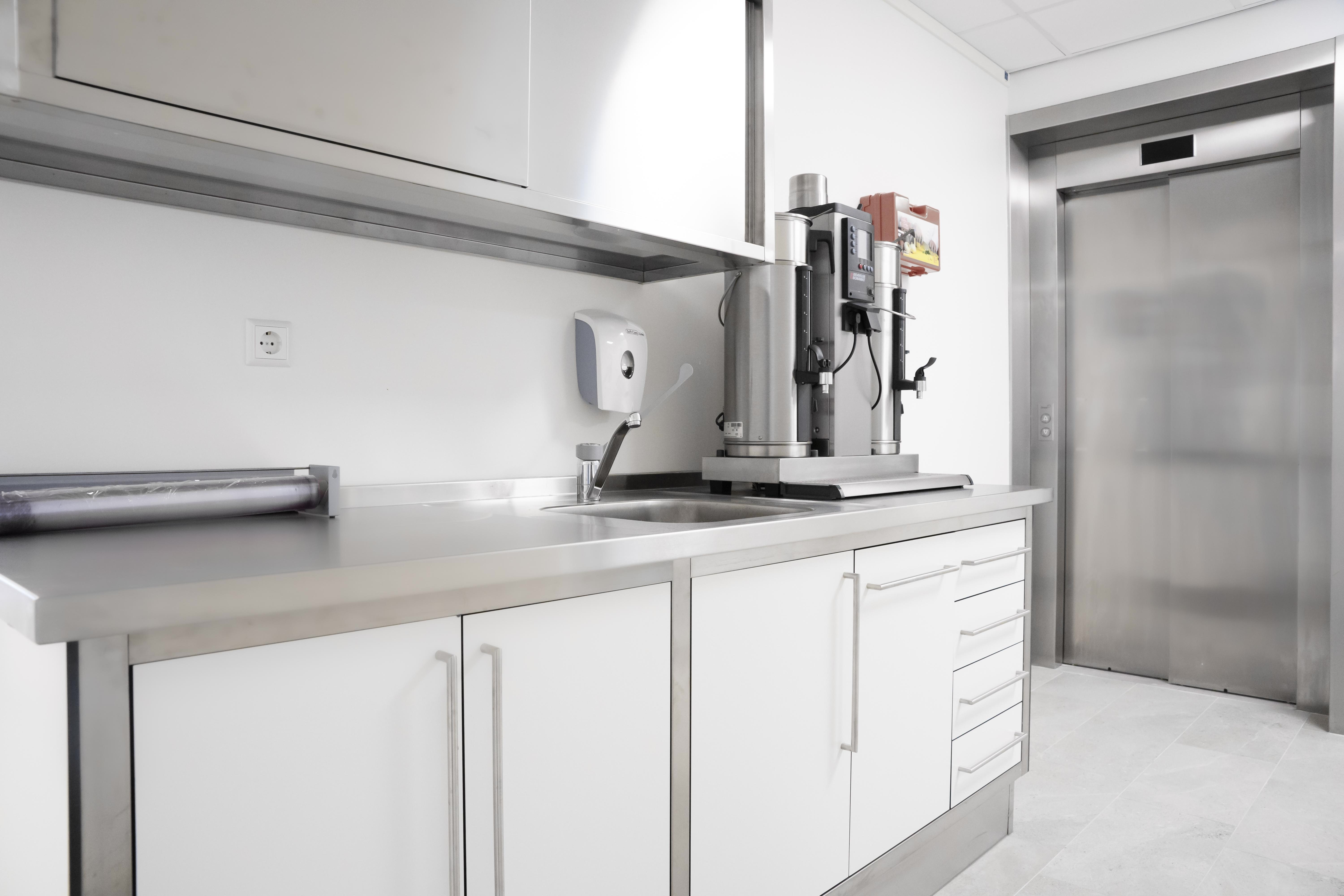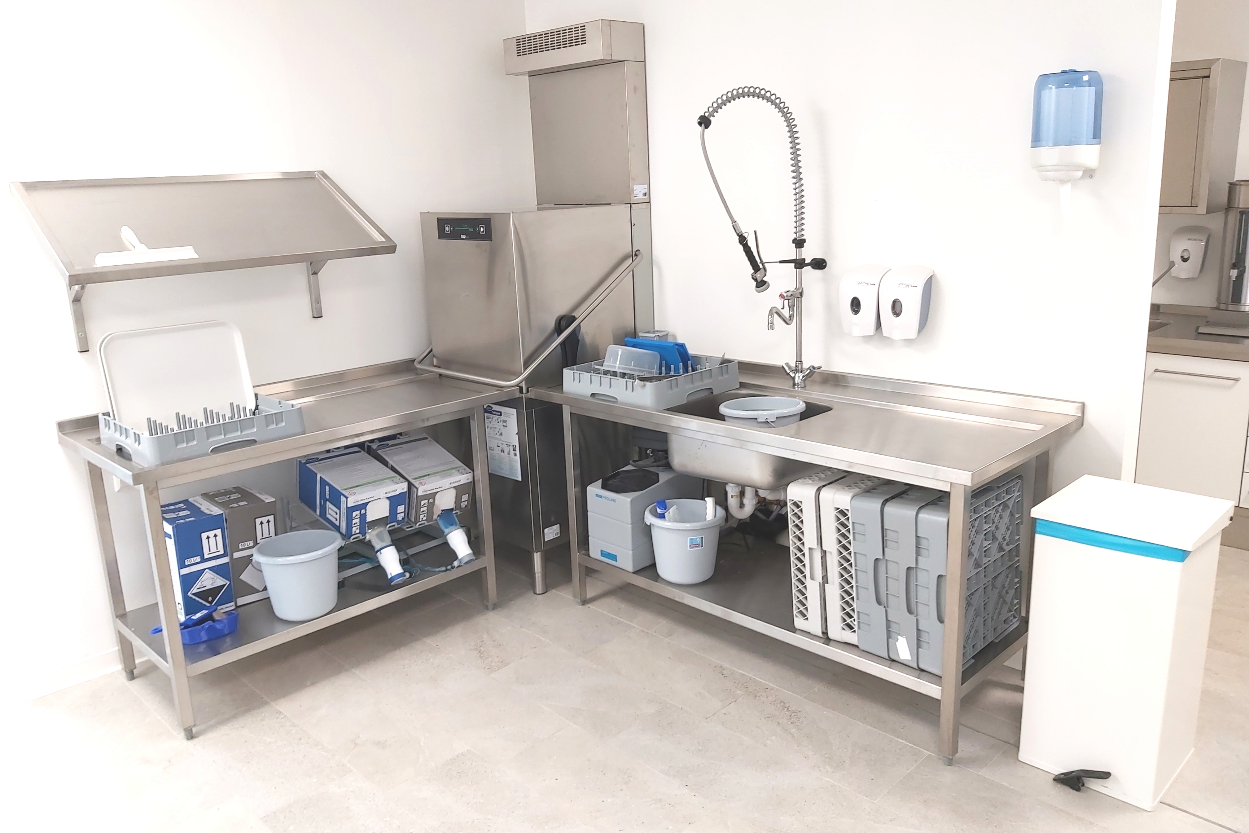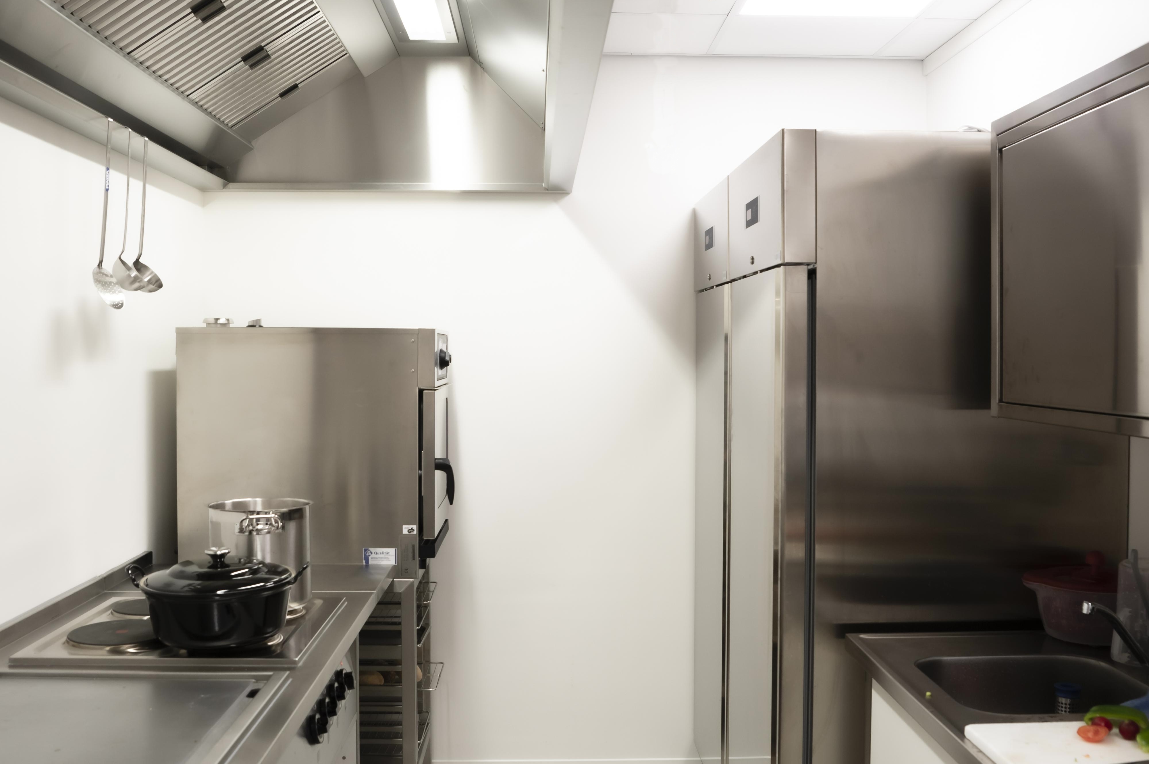 De kleinere ruimtes zijn ingevuld als warme-, koude- en spoel keuken. Ook een koel- vriescel is er toegepast, naast de opslag.