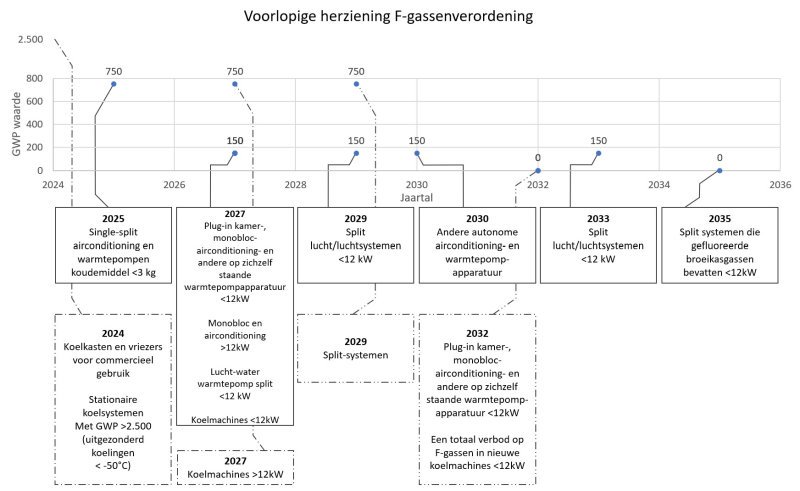 Op 11 maart jongstleden is de nieuwe EU F-Gassenverordening (EU-besluit 2024/573) in werking getreden. De Europese Unie heeft besloten de gemaakte afspraken van 2015 te herschrijven met onder andere als resultaat per 1 januari 2025 de uitfasering van F-gassen met een hoog GWP (Global Warming Potential) versneld te gaan uitvoeren.